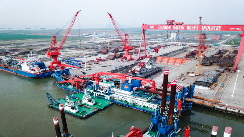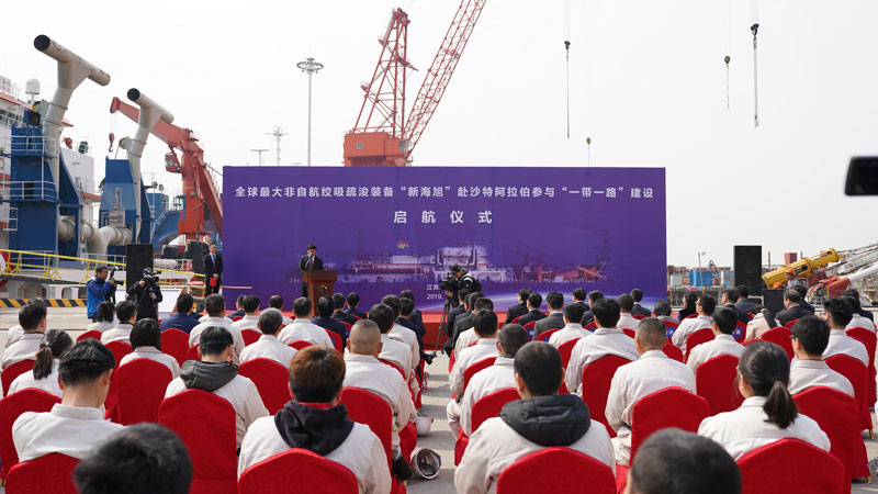 On April 2, the Sailing Ceremony of world’s leading non-self-propelled cutter suction dredger “New Haixu”, invested by Jiangsu Haihong Construction Engineering Co., Ltd and built by Jiangsu Haixin Shipping Heavy Industries Co., Ltd (Jiangsu Haixin), for the participating of “the Belt and Road Initiative Construction” at Saudi Arabia, was held at the site of Jiangsu Haixin. “New Haixu”s this trip is to take part in the building of artificial island, which shall serve the offshore oil and gas extraction projects of Saudi Aramco Oil Company with operation span of 820 days.