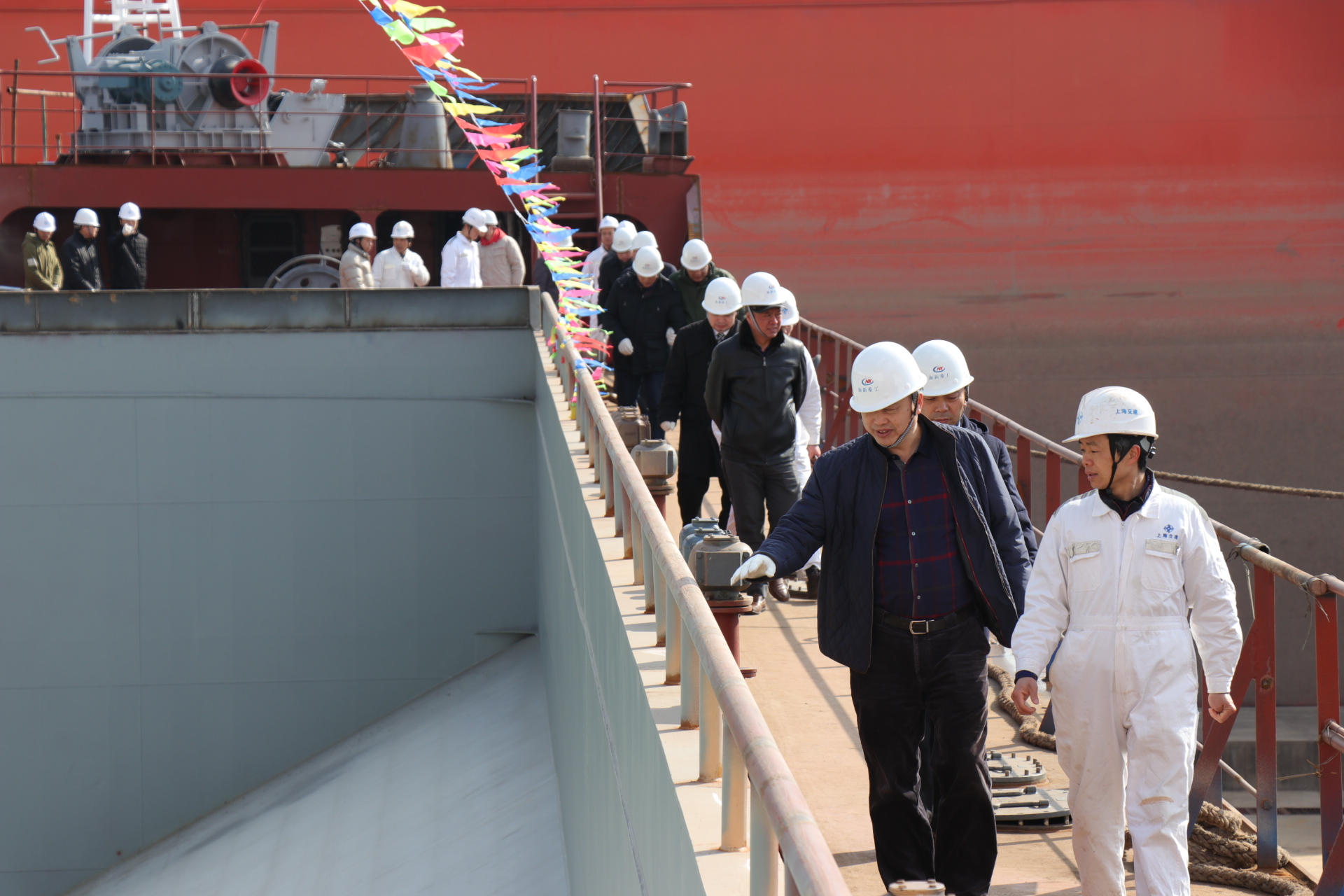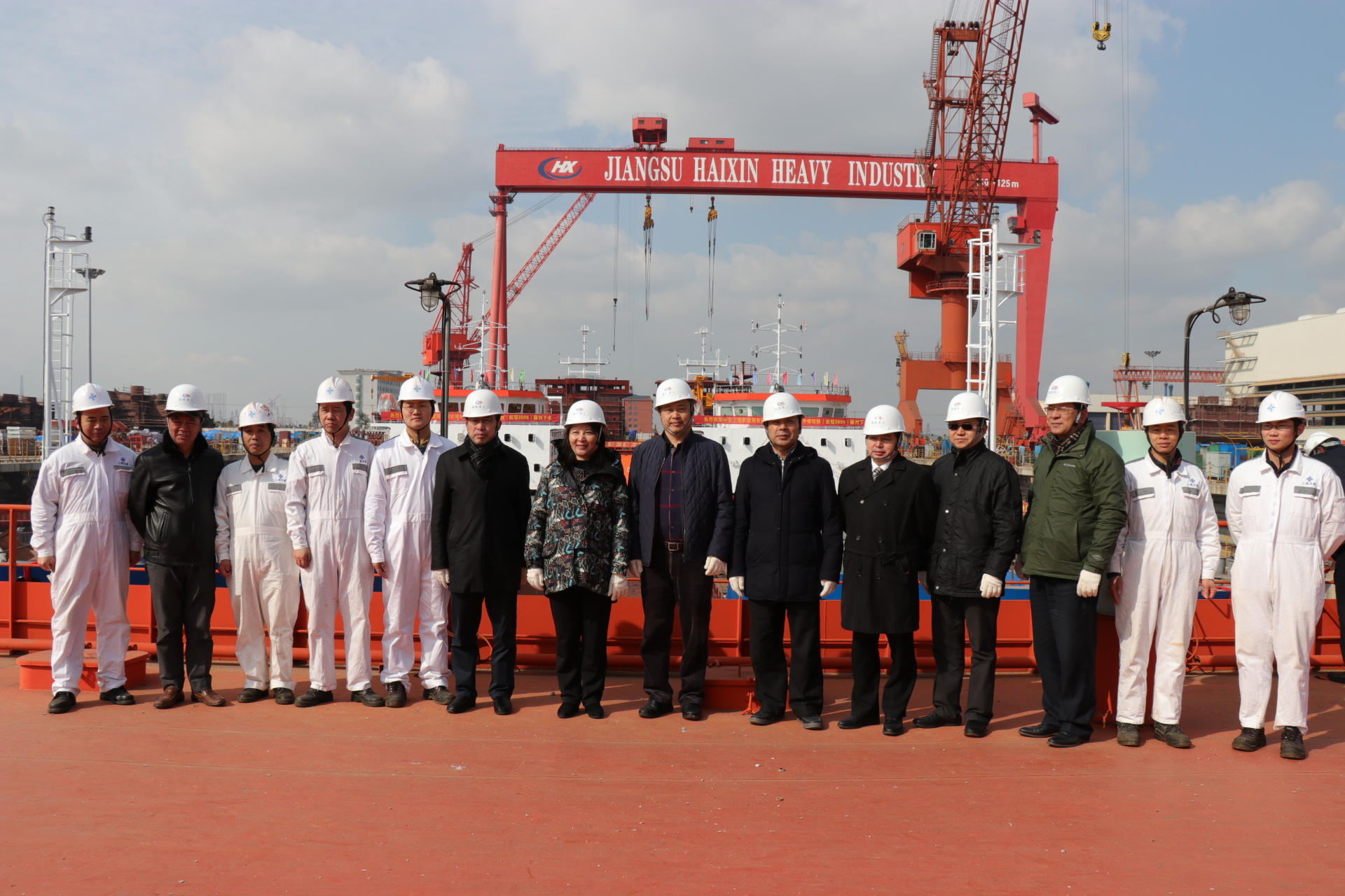 江蘇海新重工副董事長(zhǎng)陳五洲主持下水儀式。中交上海航道局有限公司侯曉明董事長(zhǎng)充分肯定了江蘇海新重工對(duì)本次建造的3000 m³自航開(kāi)體駁付出的努力,并且要求海新再接再厲,盡快完成船舶交付工作。在聲聲爆竹聲中由海門(mén)市市長(zhǎng)郭曉敏女士完成了“擲瓶禮”,香檳在船頭摔得粉碎,預(yù)示這兩艘新泥駁船將永遠(yuǎn)航行平安,隨后工人打開(kāi)了塢門(mén)水泵,最終儀式在江水涌出后沖擊形成的陣陣水花中結(jié)束。