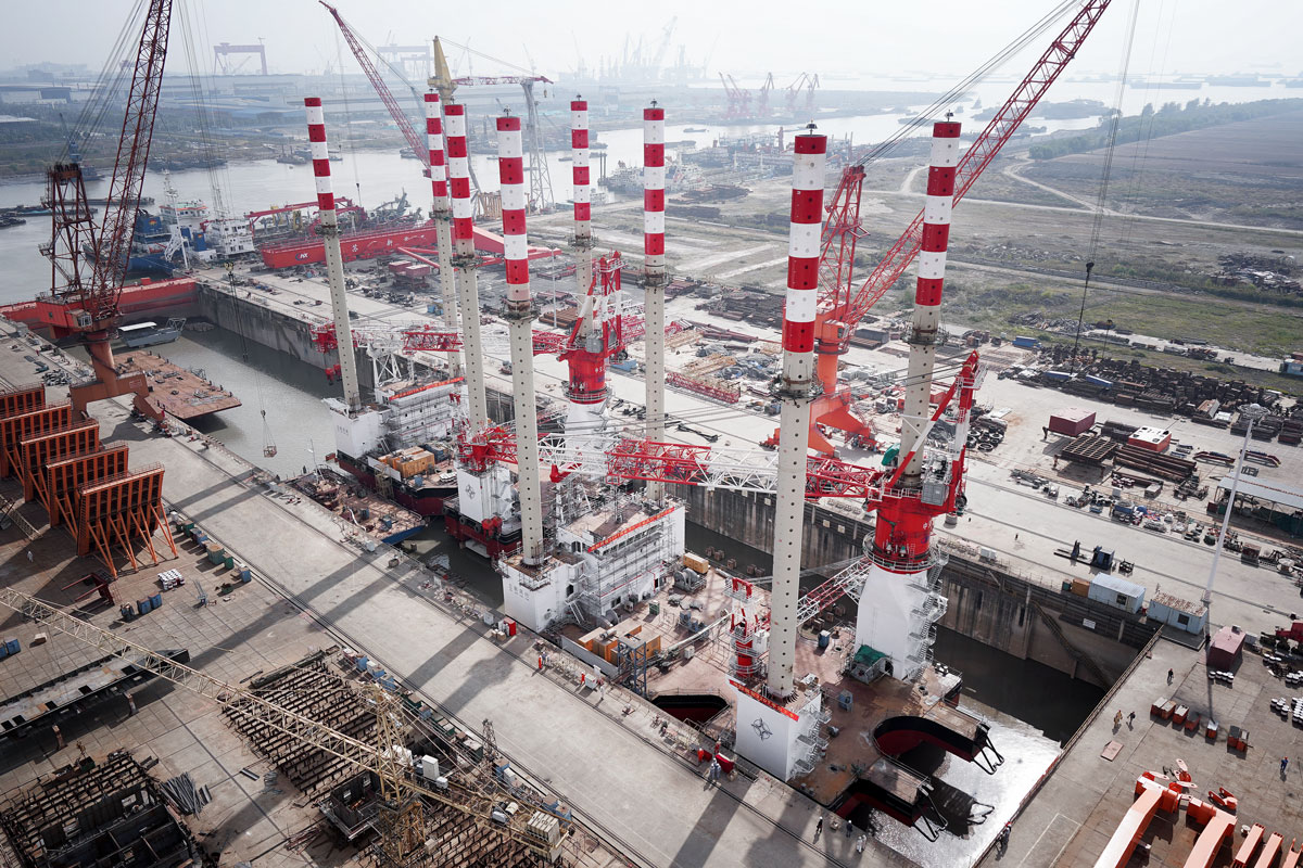 2021年6月17日,由江蘇海新船務(wù)重工有限公司制作的8MW吸力式導(dǎo)管架基礎(chǔ)A12和10MW吸力式導(dǎo)管架基礎(chǔ)A13兩套導(dǎo)管架裝船,綁扎完畢,開往招商重工...